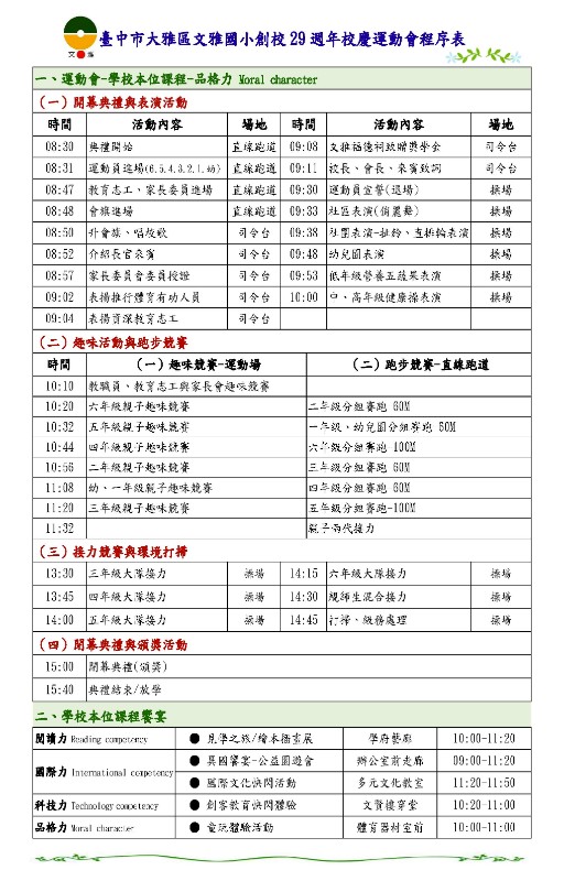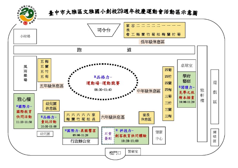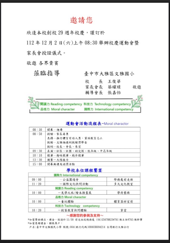 親愛的家長您好: 文雅國小29歲了!12月2日(六)校慶運動會,學校師生、家長會及教育志工攜手合作,準備了精采的校慶活動,邀請家長們、社區人士或畢業校友,都能蒞校一起同樂。 校慶活動多元展示了學校本位課程成果,有品格力的運動競賽、趣味競賽、親子接力與童玩體驗,也有閱讀力-繪本插畫與見學之旅分享、國際力的異國美食公益園遊會與國際文化快閃活動,以及科技力創客教育快閃體驗,誠摯邀請您蒞臨分享孩子們的喜樂及榮耀。 備註1:運動會-親子兩代接力,採事先報名,另發報名表到班上。 備註2:因校內停車空間有限,不開放汽車停放,只開放機車(機車位有限,請多共乘或步行)請見諒。 |