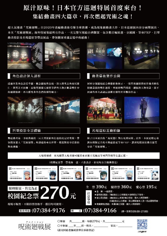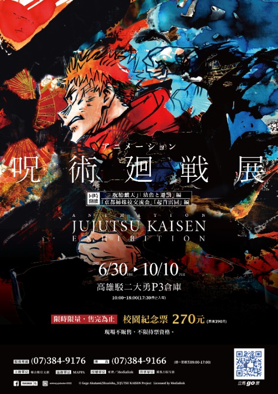 為充實國人文化藝術視野、推廣動畫教育、增進國際教育的深度與廣度,本公司特引進日本超人氣漫畫「咒術迴戰」展覽。「咒術迴戰」自2020年改編動畫後引爆全球熱潮,成為現象級動畫大作,於日本巡迴展內容分兩期展出,本次「咒術迴戰展」海外特展集結所有作品,一次完整呈現給台灣觀眾,期待透過包含數百幅原畫、分鏡圖、等身FRP、巨型動畫投影及名場還原等豐富展品,一窺圖像授權產業成功背後的密訣! |