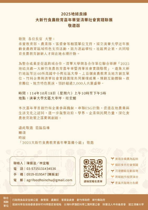 【訊息轉知】教育部委託國立清華大學於114年10月18日(六)辦理「2025地結良緣─大新竹食農教育嘉年華暨清華社會實踐聯展」活動