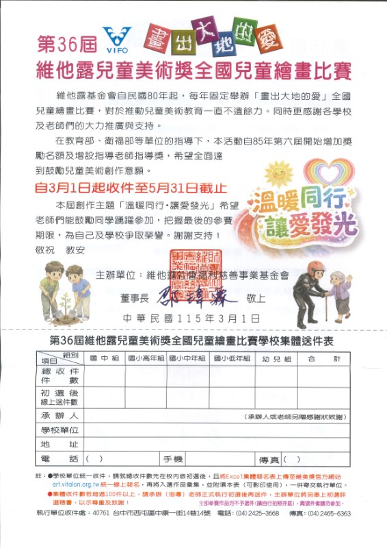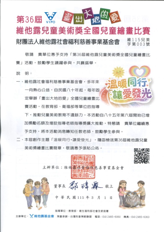 第36屆維他露兒童美術獎全國兒童繪畫比賽 有意參加者..請參閱附件 並請將作品交至輔導室 陳建宏老師 24834568*744 本校繳交期限為 115.05.27(三)