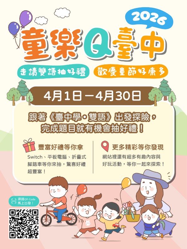 為規劃本市115年兒童節慶祝活動,本局以「童樂Q臺中 」為主題辦理系列活動並建置專屬網站,請各校配合下列事項: |