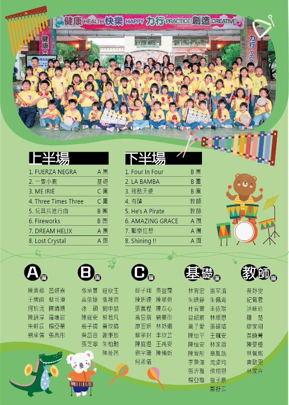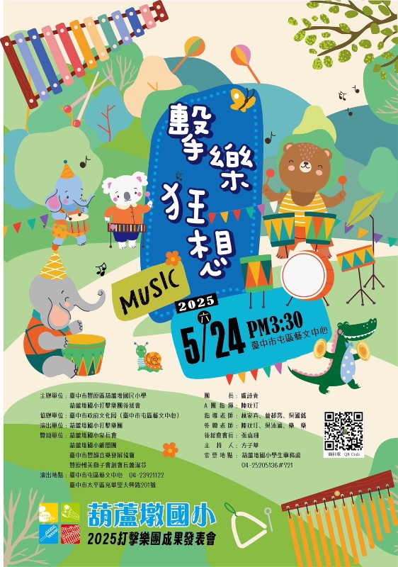 1.演出時間:114年5月24日(六)15:30 2.演出地點:屯區藝文中心演藝廳 3.演出成員:打擊樂A團/B團/C團/基礎班/教師團 4.索票方式:5/13(二)起8:00〜8:30、12:00〜12:30至本校學務處畫位取票(免費) 5.索票張數:4張為上限。 6.附件為音樂會海報和演出曲目單。 誠摯邀請大家一起蒞臨聆聽!