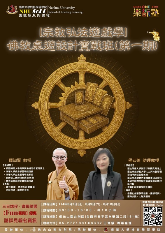 希望培育有意投入桌遊教學場域之學習者,提升桌遊教學所應具備之知識與技能。透過遊戲設計演練創新弘法方式,可以輕鬆學習佛法,探索佛教的不同面向。 |
