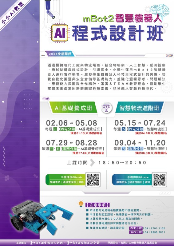 說明: 一、 為激發學生對機器人科技與程式設計的興趣,培養自動化搬運與安全倉儲等基礎能力,並強化邏輯思考、問題解決、應變能力與團隊合作精神,本館西屯分館與台灣STEAM教育機器人發展協會合作辦理「mBot2智慧機器人AI程式設計-西屯AI基礎養成班」,歡迎對該課程有興趣之學生報名參與。二、 活動時間及地點:115年2月6日至5月8日,每週五,18:50-20:50,共10堂課,於本館西屯分館3樓多功能活動室。三、 活動對象:國小三年級以上至國中生,共25位名額。四、 報名日期及方式:115年1月10日起開放報名至額滿為止,填妥報名表後請至西屯分館1樓服務台報名,並繳交報名費用即完成報名手續。