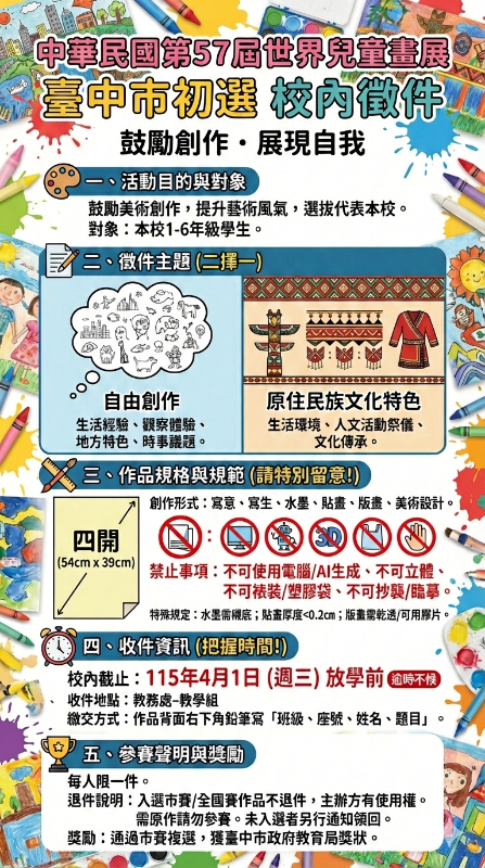 【公告】「中華民國第57屆世界兒童畫展」臺中市徵集活動計畫