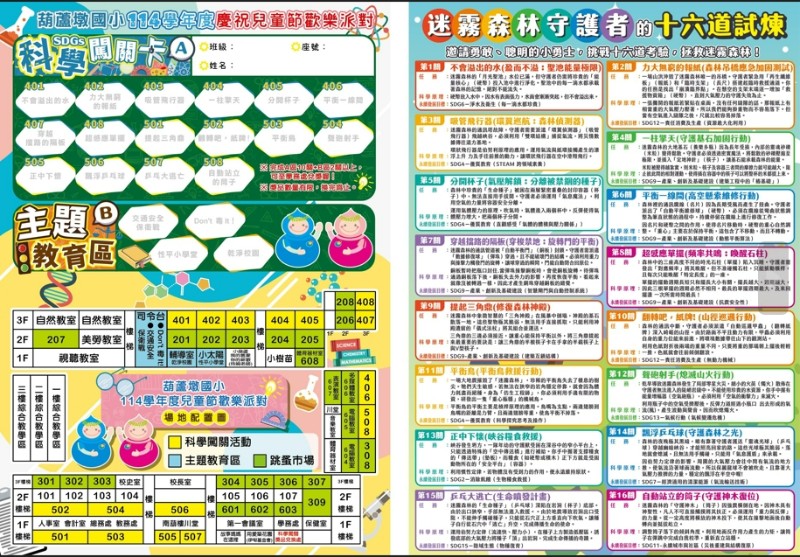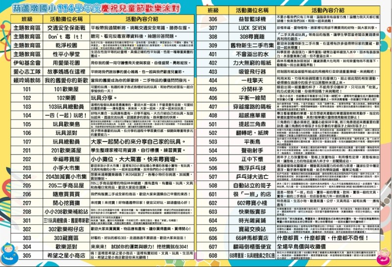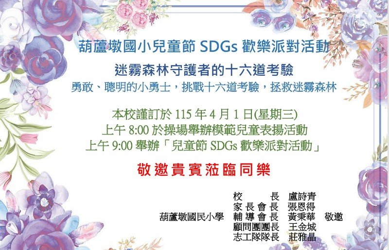 1.本年度兒童節慶祝大會暨歡樂派對活動訂於115年4月1日(三)上午八時至十二時。 2.地點:操場和各班教室(詳見場地配置圖)。 3.邀請卡將於3月25日(三)發放給每位學生,邀請家長共襄盛舉。 4.各班均設有攤位,一年級玩具分享日,二、三、六年級跳蚤市場,四、五年級科學闖關遊戲,本活動詳細資訊請參閱附件檔案。 5.除此之外,亦有葫蘆墩國小志工隊、退休教師、學務處、輔導室和伊甸基金會到校設攤,歡迎大家蒞臨體驗。 6.闖關活動兌換獎品標準:科學遊戲區A至少(含)10關+主題教育區B至少(含)2關,即可前往兌獎。 7.本次活動在校門內南葫樓穿堂設置活動大型看板,歡迎大家踴躍前往拍照留念。 8.因應食品安全,以及推動乾淨校園,請入校參與活動的家長們勿攜帶食用性的飲品或點心,感謝配合。 9.詳細活動資訊,請參閱附件檔案。