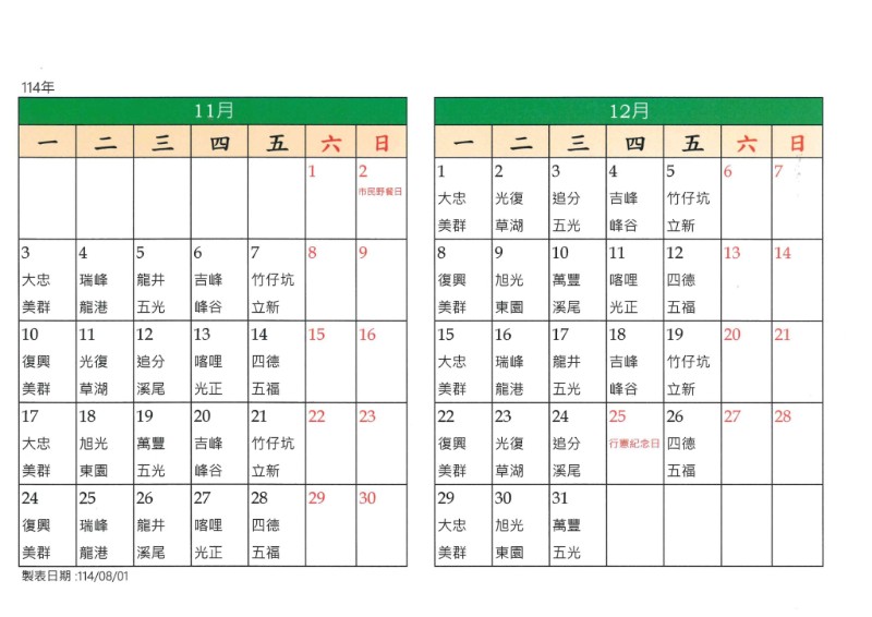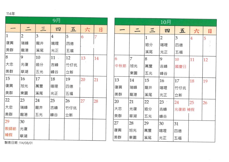 114學年度第一學期臺中市立圖書館大里分館行動圖書車駐校服務時間為: 9/12.9/26.10/17.11/7.11/21.12/5.12/19.1/2.1/16 請參閱附件