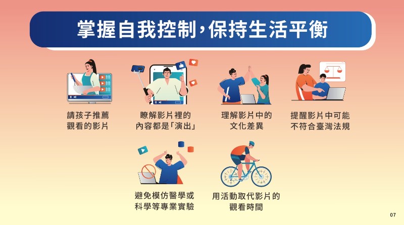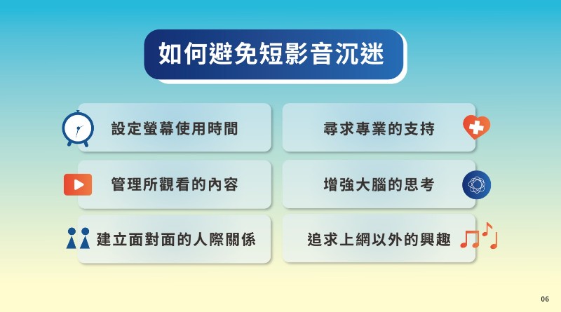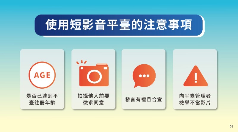 由於短影音的內容往往需要在幾秒鐘之內吸引受眾的注意力,無法完整的呈現一個故事或概念,且學生容易受到影視作品的影響而產生模仿行為,若學生看了影片之後模仿,可能在過程中因操作不慎或其他突發事件導致後果不堪設想。面對這股短影音大浪,我們能做的不是去抗拒它,而是去瞭解它、接受它、疏導它,懂得培養「免疫力」,懂得「停看聽」,不盲從,培養保持懷疑並主動查證資訊真偽的態度,也不幫忙擴散未經核實的內容,能正確的面短影音,能合理、合宜及合法的暢遊網路世界。