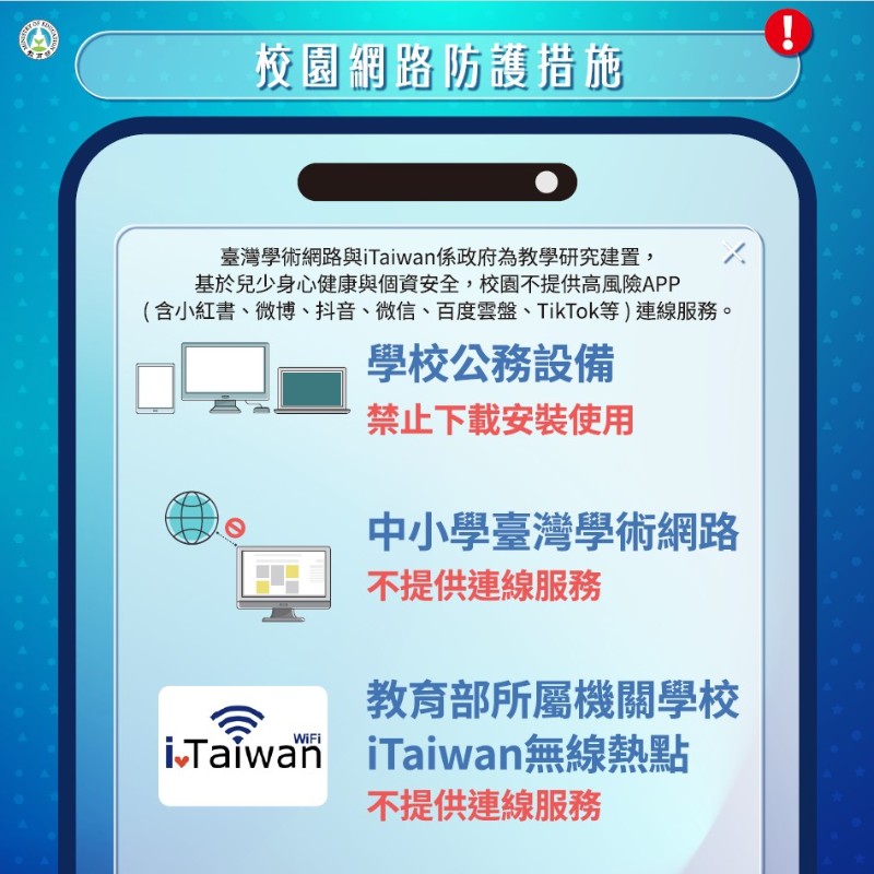 二、宣導主題:「拒絕短影音風險:別被演算法牽著走,思辨、查證、要求助」 (一)學生在短影音與社群平臺正在面臨的真實風險,從跟風挑戰、自殺自傷事件,以及注意力被快速切割、假資訊與詐騙擴散,再到網路霸凌與性影像外流的威脅,這些問題都不再只是個案,而是日常正在發生的狀況。 (二)國際社會已高度警覺短影音及社群平臺對兒少可能帶來的風險,許多國家已陸續實施及規劃完全禁止兒少使用短影音平臺(含社群平臺),並訂有罰款、年齡及身分認證等具體保護級應對措施,以澳洲為例,禁止16歲以下兒少使用,平臺違規最高可罰10億臺幣,愛爾蘭因Tik Tok未充分保障兒少使用者,裁罰新臺幣126.53億元;其他國家則透過年齡限制或家長同意機制,保障兒少在網路上的安全。 (三)在國內部分,數位發展部已警示抖音、小紅書、微信、微博、百度雲盤等APP具資安風險,且Tik Tok具有害兒少身心內容,依資通安全管理法第11條規定及兒童及少年福利與權益保障法第43、46-1條規定,針對具高度資安風險、具有害兒少身心內容的高風險APP,校園內網路防護措施包含:公務設備禁止下載安裝使用、中小學臺灣學術網路(TANet)不提供連線服務,並新增教育部所屬機關學校iTaiwan無線熱點不提供連線服務。 (四)請學校於相關學習活動警示避免使用高風險APP,適時標註警語、避免特寫畫面,減少長度及時間,強化教材選擇適切性,並鼓勵運用本部「不迷小紅書,青春不迷途」、「短影音識讀站」等教學資源 1.「短影音識讀站」(https://reurl.cc/aMjQvD),分別建置抖音/TikTok、YouTube、Facebook/Instagram三個專區,蒐整相關新聞、懶人包、主題文章、學習手冊、廣播、教材包、教材教案及線上課程等。 2.「不迷小紅書,青春不迷途」專區(https://reurl.cc/rKjpxy),匯整新聞文章、懶人包、學習手冊、短片廣播、教案、研習資源與講師資料庫等。 (五)請持續向學生及家長宣導四大支持措施: 1.衛生福利部提供支持服務資源:建置網路成癮專區、「心快活」心理健康學習平臺,建立正確觀念與自我覺察;設有1925安心專線、性影像處理中心、謝謝你跟我說-文字協談服務,提供危機介入與數位支持;透過社區心理衛生中心、青壯世代心理健康支持方案,提供專業資源支持網絡。 2.持續強化媒體素養教育:十二年國民基本教育課程綱要總綱,核心素養「科技資訊與媒體素養」,社會、科技等相關領域課綱及教科用書,均已納入「科技資訊與媒體素養」相關學習內容。教師依據教科書內容,教授資訊科技之合理使用原則、個人資料之保護以及資訊科技對人與社會的影響與衝擊等議題,請學校持續透過課程與教學推動,培養學生數位素養、網路禮儀、上網安全等議題知能,進而分析思辨科技、資訊及媒體訊息之能力。 3.推動戶外教育及社團活動:請學校持續推動跨校及社區合作以擴大社團量能,協助家長/學生轉移社交活動重點。 4.推廣家長守護數位工具包:教育部推出免費數位工具包(https://reurl.cc/qKlddg),結合三大電信業者、各縣市家庭教育中心及數位機會中心,協助家長設定 App使用時間管理及過濾不當內容等重要功能。 |