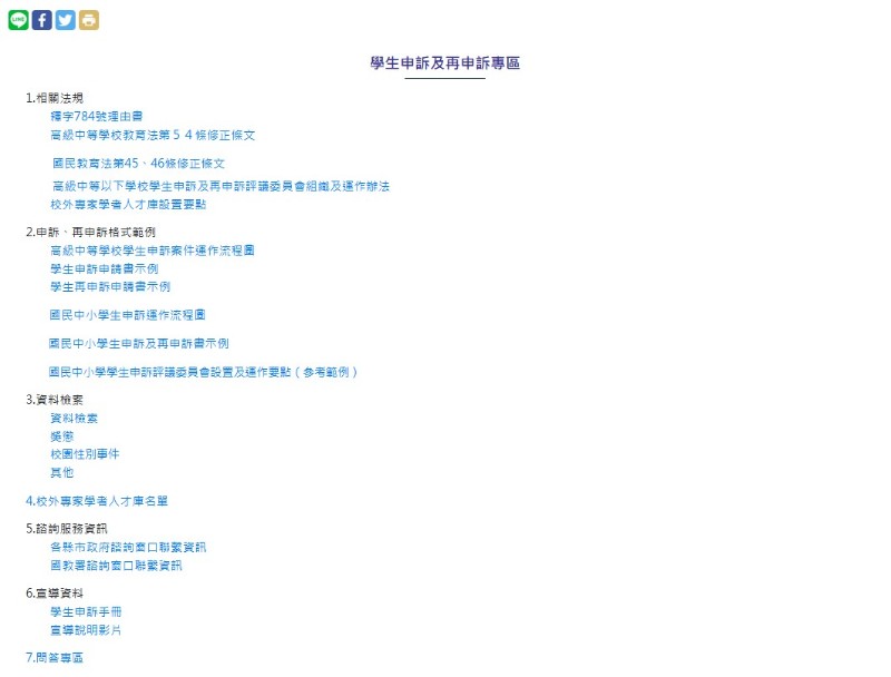 教育部國民及學前教育署業於該署學生事務資訊暨活動網站建置「學生申訴及再申訴專區」(網址:https://friendlycampus.k12ea.gov.tw/StudentAffairs/54/2)。並設置「相關法規」、「申訴、再申訴格式範例」、「資料檢索」、「人才庫名單」及「諮詢服務資訊」、「宣導資料(含學生申訴手冊)」及「問題專區」等資料,提供下載運用。