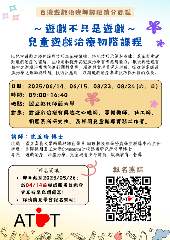說明: 一、~遊戲不只是遊戲~兒童遊戲治療初階課程(中部場)課程時間及相關資訊。 (一)工作坊 1、日期:06/14(六)、06/15(日)、08/23(六)。 2、時間:09:00-16:40,每日以6小時計。 3、地點:國立彰化師範大學(場地待定)。 4、講師:沈玉培 博士主講。 (二)團體督導 1、日期:08/24(日)。 2、時間:09:00-16:40,每日以6小時計。 3、地點:國立彰化師範大學(場地待定)。 4、講師:沈玉培 博士主講。
