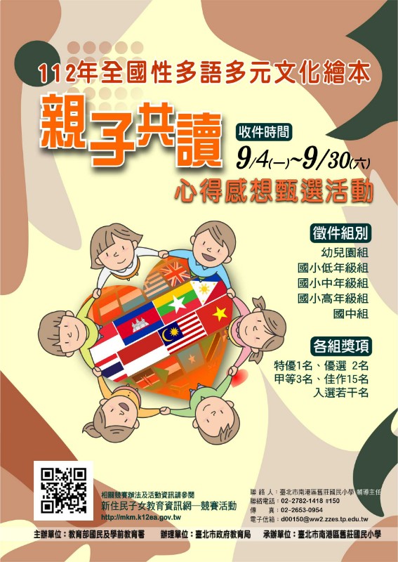 轉知教育部國民及學前教育署委請臺北市政府教育局辦理「112年度全國性多語多元文化繪本親子共讀心得感想甄選活動」