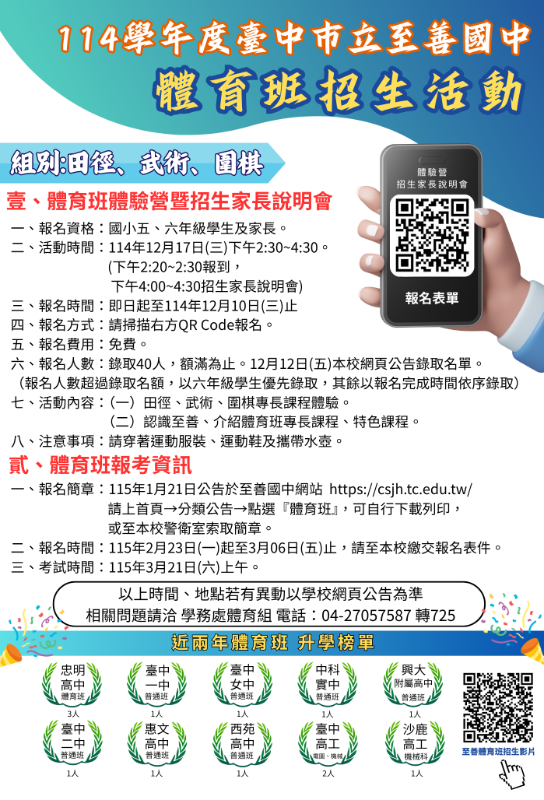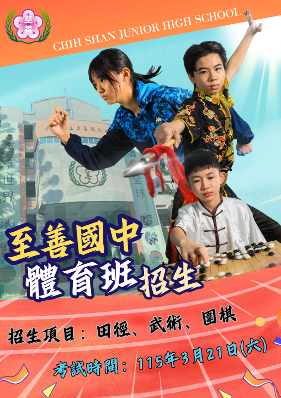 【招生簡章】至善國中115學年度體育班招生項目為:田徑、武術、圍棋 |