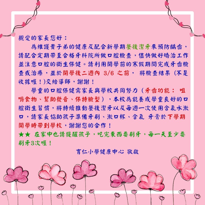 親愛的家長您好: 做口腔檢查,儘快做好矯治工作並注意口腔的衛生保健。 請利用開學前的假期期間 完成牙齒檢查或治療,並於開學後二週內 3 /6 之前, 將檢查結果 (不是收據喔!)交給導師,謝謝! 學童的口腔保健需家長與學校共同努力(牙齒功能: 咀嚼食物、幫助發音、保 持臉型),本校為能養成學童良好的口腔衛生習慣,將持續推動餐後潔牙以及每週一 次使用含氟水漱口,請家長協助孩子準備牙刷、漱口杯、含氟 牙膏於下學期開學時帶到學校,謝謝您的合作! ★★ 在家中也請提醒孩子,吃完東西要刷牙,每一天至少要刷牙3次喔!
