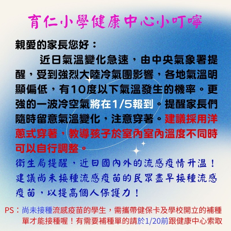 | 標題 | 健康中心小叮嚀~ 低溫提醒!流感疫情升溫,建議尚未接種流感疫苗者可盡早安排疫苗接種! |