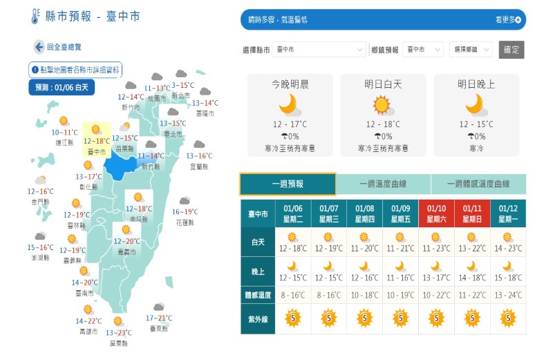 交通部中央氣象署各地區氣溫預報查詢 https://www.cwa.gov.tw/V8/C/W/County/County.html?CID=66