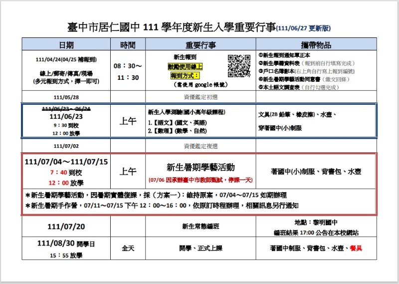| 標題 | 臺中市居仁國中111學年度新生入學重要行事(111/06/27更新版) |