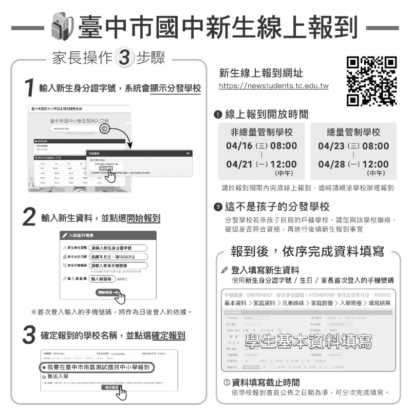 - 配合教育局政策,本年度採臺中市公版新生線上報到系統(詳參附件說明),依操作流程進行報到即可,就不用到現場報到喔。若無法線上報到者,可於 04/27(日)上午8:30〜11:30到本校現場報到