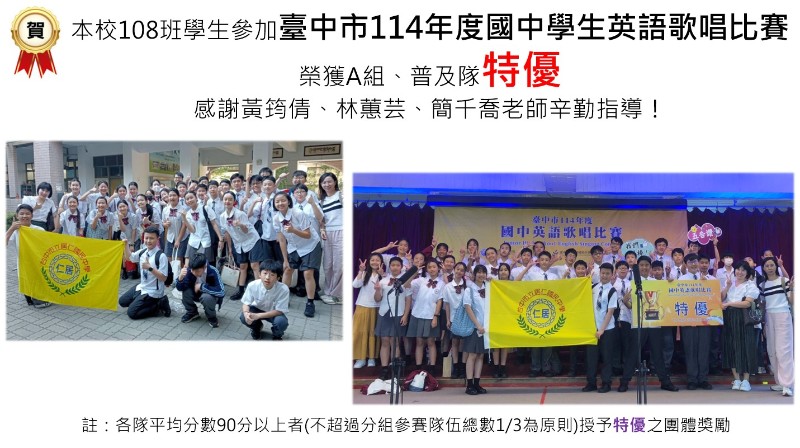 賀!本校學生參加臺中市114年度國中學生英語歌唱比賽榮獲特優!