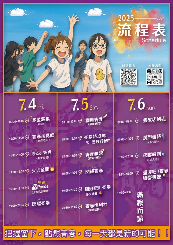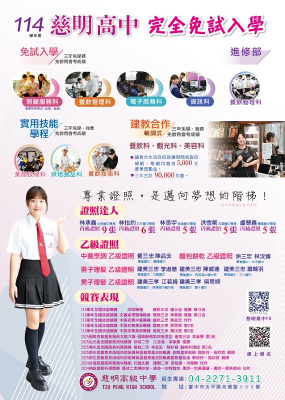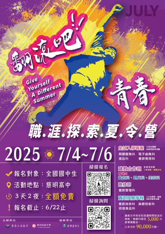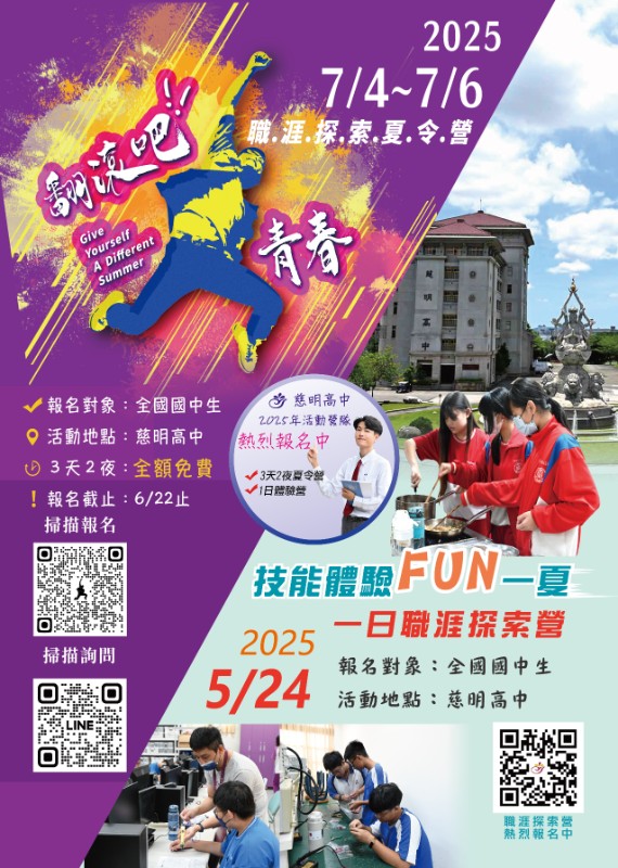 說明: 一、 為協助國中生認識技職內涵,盼透過技能體驗活動,帶領學生生涯探索。 二、 <技能體驗FUN一夏>一日職涯探索營,訊息如下: (一) 時間:114年5月24日(六)。 (二) 地點:慈明高級中學。 (三) 對象:全年級國中生。 (四) 報名方式:敬請於114年5月21日(三)前報名,如附件報名表QRcode。 三、 <翻滾吧!青春>三天兩夜夏令營,訊息如下: (一) 時間:114年7月4日(五)至6日(日),三天兩夜全額免費。 (二) 地點:慈明高級中學。 (三) 對象:全年級國中生。 (四) 報名方式:敬請於114年6月25日(三)前報名,如附件報名表QRcode。 四、 聯繫單位:教務處丁茂栓主任、電話:0920-660683。