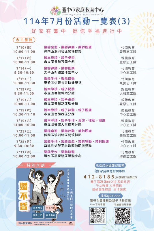 114年7月份活動一覽表|☀️暑假限定 上架! 臺中市家庭教育中心邀您一起參與本月豐富多元的課程活動~親職教育、青少年溝通、數位教養、情緒管理、婚姻經營等多元主題活動 讓我們在輕鬆互動中學習,共同打造更幸福、和諧的家庭關係! 🌻更多詳細內容洽本中心活動海報、FB及LINE公告資訊 🤳歡迎加入FB官方粉絲專頁、按讚、分享及追蹤更豐富的活動資訊 #好家在臺中 #挺你幸福進行中