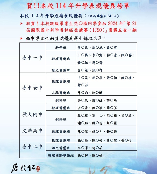 本校114年升學成績表現優異,再創高峰 榜單如附件 狂賀!本校跳級畢業生范Ο揚同學參加2024年「第21屆國際國中科學奧林匹亞競賽(IJSO)」榮獲五金一銅。