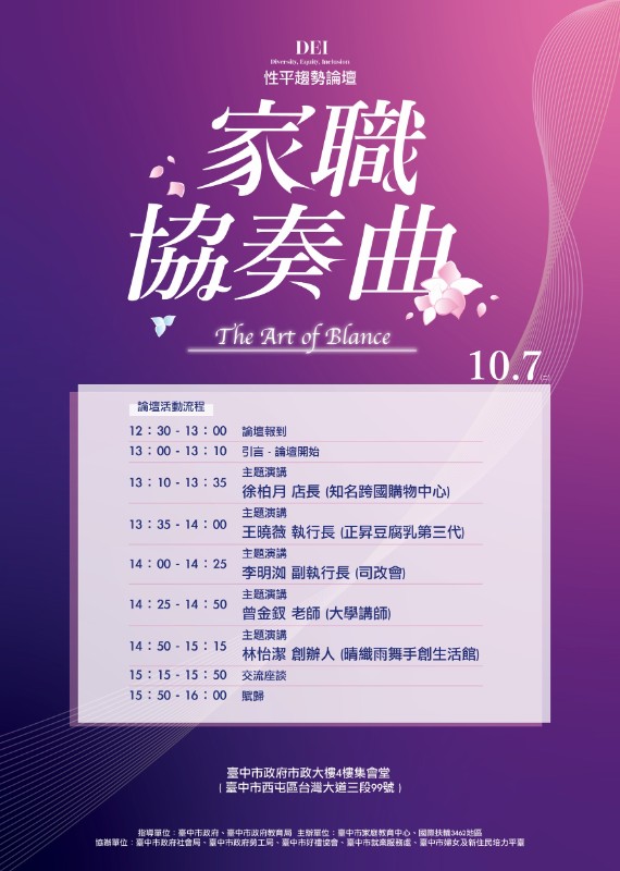女力的轉變,不只是角色的擴展,更是一種價值觀的轉變—女性韌性能在職場綻放專業光芒,同時在家庭中展現溫暖力量。本中心本次攜手國際扶輪3462地區策劃「家職協奏曲」論壇,期望透過一場場對話,讓社會看見女性在職場、家庭及各領域的優質表現,也鼓勵家庭成員一同思索如何攜手合作,演奏出屬於自己的幸福樂章。 |