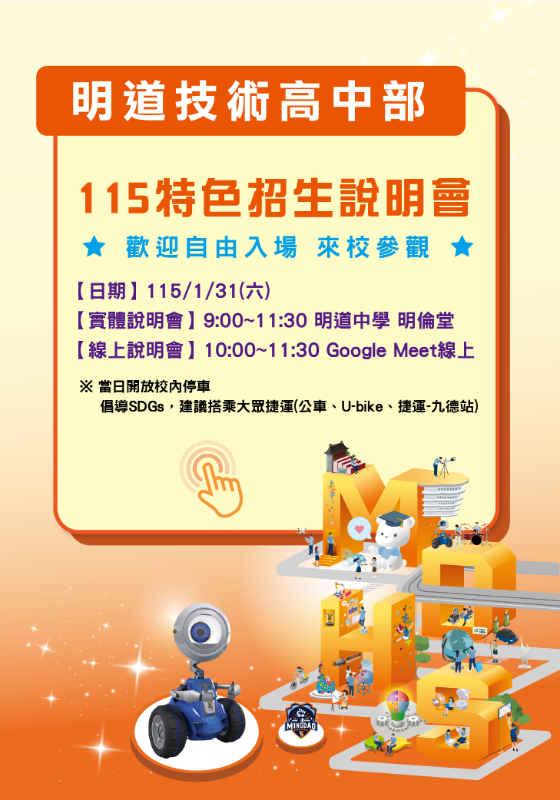 明道特色招生系列活動: 一、特招說明會:115年1月31日(六)開放自由入場 來校參觀 二、特招特訓班(免費):115年3月7日(六) 三、特招「考試」報名:115年3月9-13日 四、特招考試:115年4月11日(六) ------------------------------------------------------------------------------------------------- |