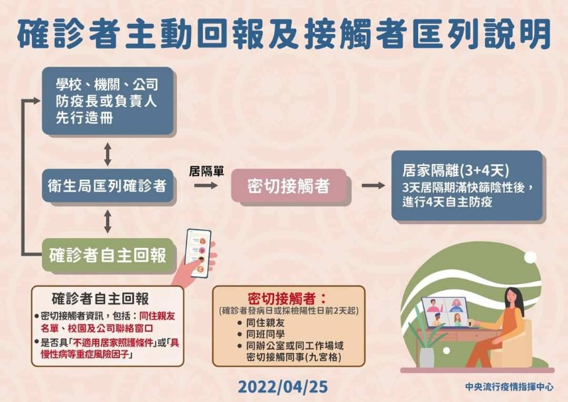#4月25日起實施重點疫調 #自4月26日起縮短居家隔離天數為3+4天,另回溯目前已居隔超過三天者,自4月27日開始解除隔離❗️ #居隔(最後接觸日+3)、自主防疫(4天), #快篩陰性可工作但無法上學。 所以學生還是要請防疫假7天 https://www.cna.com.tw/news/ahel/202204250309.aspx #衛福編編報報 ⏲發文時間:2022.04.25 ✏️中央流行疫情指揮中心今(25)日表示,為因應本土疫情,強化防疫量能及韌性,指揮中心今日上午邀集各縣市政府針對未來防疫政策進行交流與討論,並於下午邀請專家就初步方向,協助審視及綜合評估,相關建議及共識如下: 一、 實施「重點疫調」,自即日起開始實施: (一)以確診者發病日或採檢陽性日(無症狀者)前2天起所接觸者為密切接觸者。 (二)密切接觸者包括同住親友、同班同學、同辦公室或同工作場域同事(以九宮格方式認定)。 (三)落實自主應變,確診者應主動提供衛生單位同住親友名單、校園及公司聯絡窗口等資訊,個案相關之學校、機關、公司防疫長或負責人應先行造冊,以配合提供衛生單位名冊。 (四)設置「確診個案自主回報疫調系統」:確診者收到連結網址(透過法定傳染病通報系統發送),登入後填寫上述同住親友及校方、公司、機關(構)之防疫長或其主管的姓名、住址、電話、電郵等可供聯繫之資料,再由系統發送通知書給同住親友,另通知校方、公司、機關(構)之防疫長或其主管請其匡列學校/職場之接觸者並回傳名冊,提供給衛生局開立電子居隔單以供作請假、保險、相關補助申請之依據。 二、 縮短居家隔離天數為3+4天(3天隔離+4天自主防疫);自明(26)日起實施,回溯目前已居隔超過三天者,自4月27日開始解除隔離。 (一)前3天居家隔離期間,須待在家中以1人1室為原則,不得外出。 (二)完成接觸者匡列後,安排1次快篩,如為快篩陽性則以PCR確認;隔離期間有症狀及第3天(或期滿)進行快篩,陽性者持續隔離,陰性者進行4天自主防疫,第7天快篩陰性解除自主防疫。 (三)4天自主防疫注意事項: ✏️指揮中心強調,依目前疫情趨勢,Omicron傳播力雖高,但以無症狀或輕症為主,防疫應以減災及中重症照護為重,才可合理分配防疫及醫療量能,讓防疫、生活及經濟平衡發展;也請民眾做好自主應變(主動評估住家環境,回報自身慢性病等重症因子、接觸者資訊等)、自我防護、主動配合防疫工作,保護自己也保護他人。