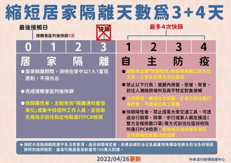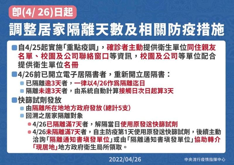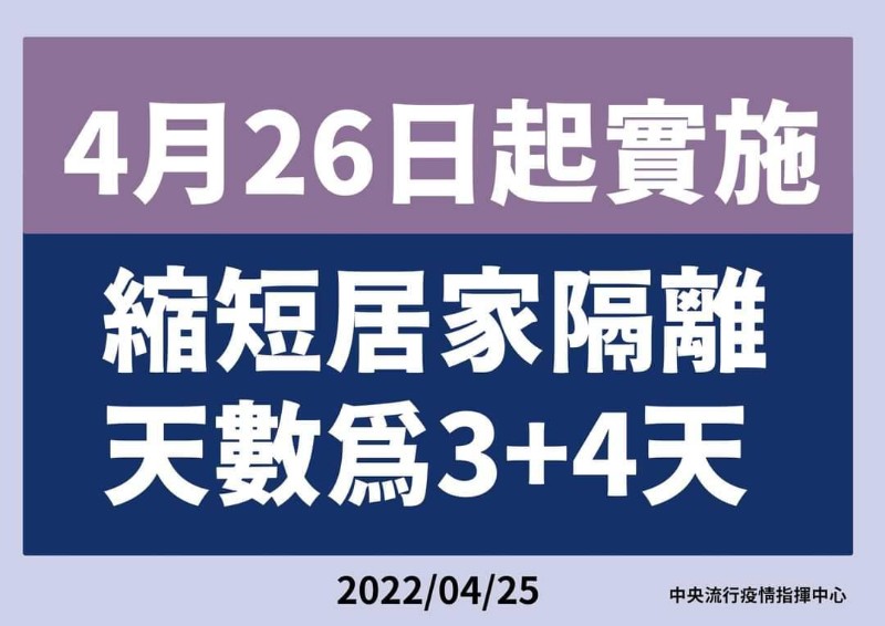 | 標題 | ❗️指揮中心宣布,4月25日起實施重點疫調、自4月26日起縮短居家隔離天數為3+4天,另回溯目前已居隔超過三天者,自4月27日開始解除隔離❗️ |