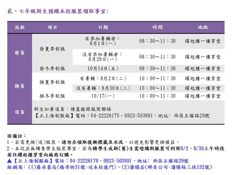 8/5補充說明: 關於有部份新生於4月新生報到時沒有向廠商訂購本校制服及班級臂章,新生或轉學生學生家長可以自行到有販賣本校制服的經銷商處購買制服及班級臂章,或是請自行打電話向【正上海制服廠】訂購,請廠商8/29或8/30帶來本校同時付款購買。 ▲【正上海制服廠】電話:04-22226170、0923-503991,地址﹕西區五權路29號 111學年度七年級新生的班級臂章顏色:深綠色底+白字+橘色邊框 110學年度入學(目前八年級生)的班級臂章顏色:橙色底+白字+黃色邊框