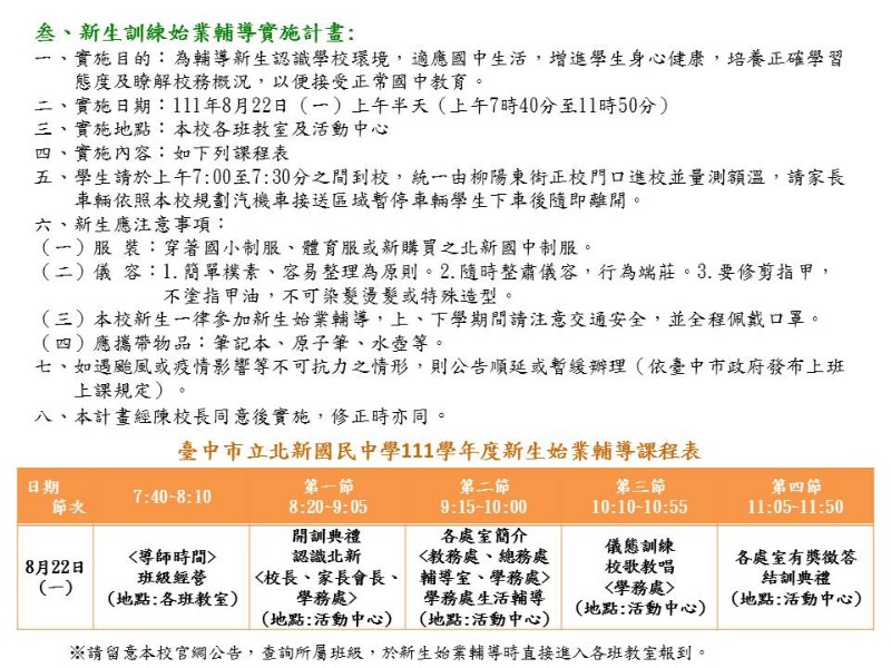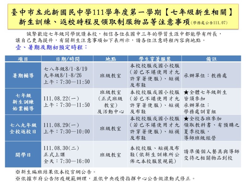| 標題 | 111學年七年級新生訓練、返校時程及領取購買制服物品相關注意事項(7/29新增公告教室位置圖) |