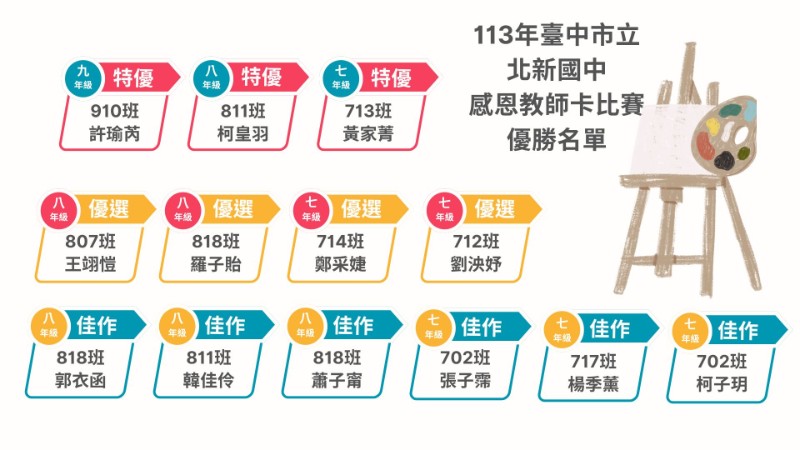 113年臺中市立北新國中感恩教師卡比賽優勝名單