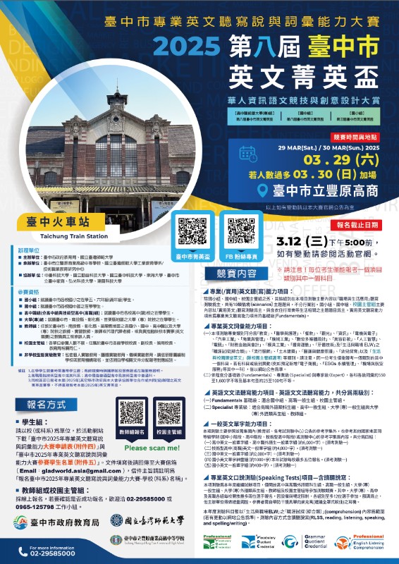 報名方式:請於114年3月12日(星期三) 下午5時前完成。請以 校(或科系)為單位,於活動網站(https://sites.google.com/v iew/tcccompetition/)下載「臺中市2025年專業英文聽寫能力 與詞彙能力大賽申請表」與「臺中市2025年專業英文聽寫能 力與詞彙能力大賽參賽學生名單」,文件填寫後請回傳至大 賽信箱(Email:gladworld.asia@gmail.com),信件主旨請 註明為「報名臺中市2025年專業英文聽寫說與詞彙能力大賽 -學校(科系)名稱」,若有任何疑問,請逕洽02-23927412 或0965-125798柯小姐/莊先生或工作人員。 |