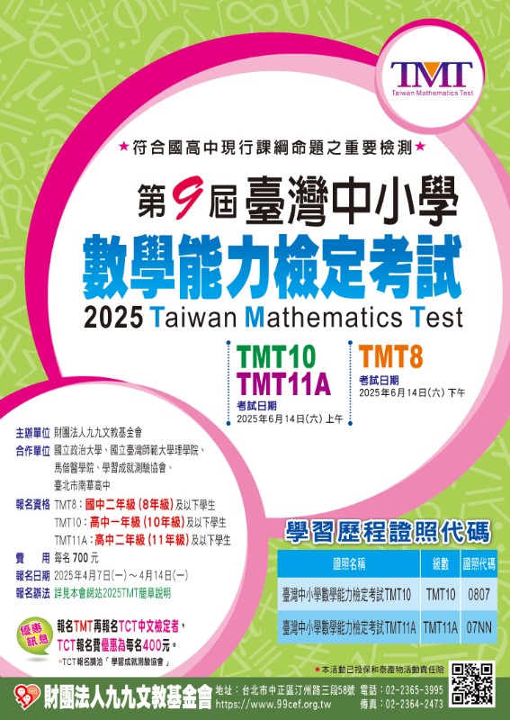 本會訂於民國114年6月14日(星期六)舉辦第九屆臺灣中小學數學能力檢定考試(Taiwan Mathematics Test, TMT),敬請 貴校鼓勵學生報名參加。 |