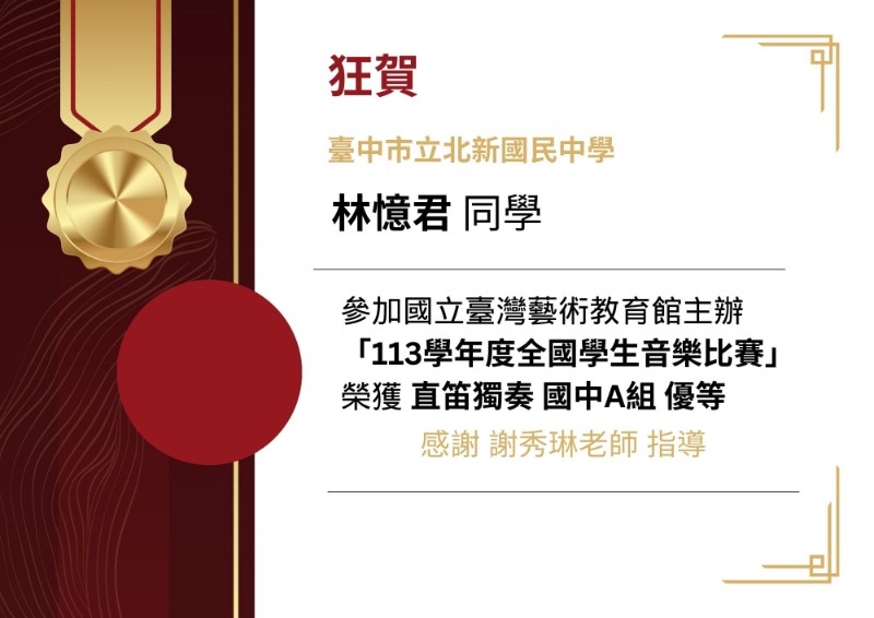 | 標題 | 本校林憶君同學參加國立臺灣藝術教育館主辦「113學年度全國學生音樂比賽」榮獲 直笛獨奏 國中A組 優等 |