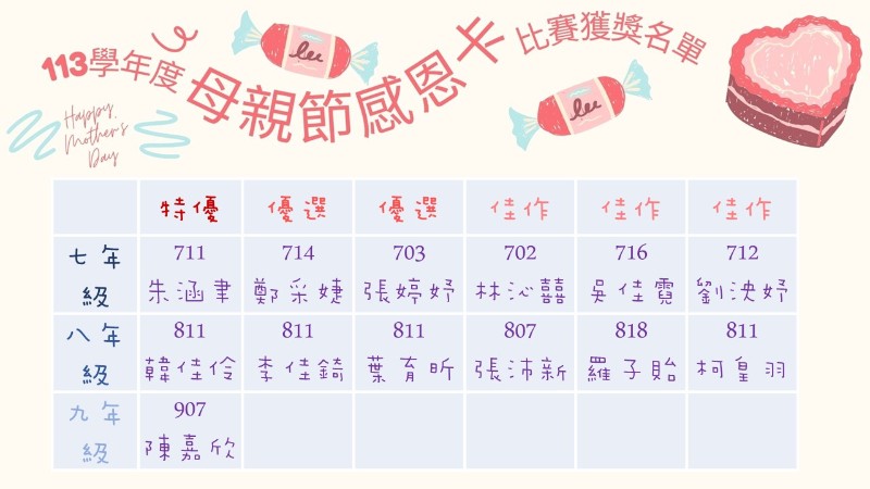 | 標題 | 113學年度慶祝母親節感恩雙語卡片製作比賽獲獎名單 |