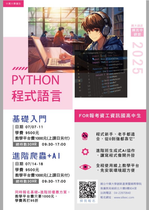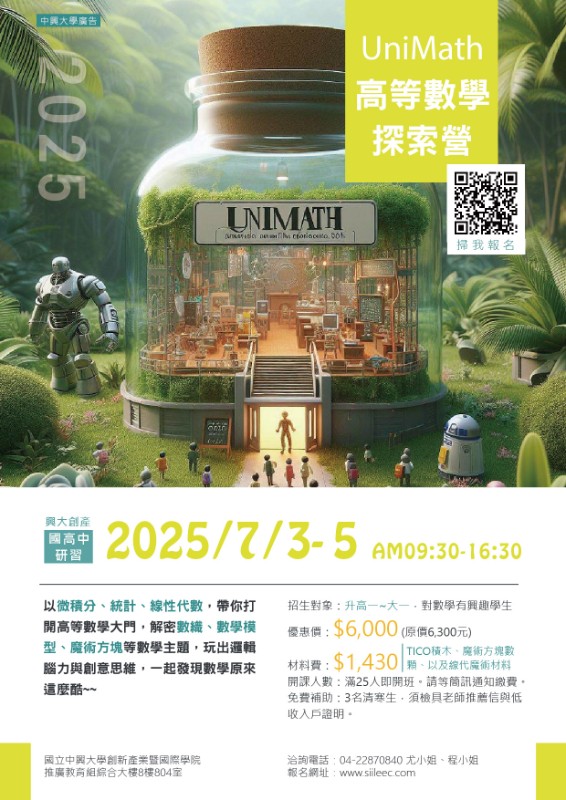 主旨:檢送本校2025年暑假UniMath 高等數學探索營、 Python程式設計系列班招生海報與簡章,即日起開放報名,請惠予公告周知,並轉知貴校學生踴躍報名參加。 說明: 一、本校將於7月1日起舉辦旨揭課程。課程特色如下: (一)《2025 UniMath 高等數學探索營》,讓同學體驗大學生必學的三個基礎課程: 微積分、統計、線性代數;並動手玩數字解謎、數學建模、魔術方塊。邀你一起玩轉數學,探究高等數學世界。 (二)《Python程式設計系列基礎入門/進階爬蟲班》,想靠程式加身以APCS加分報考資工系所,還有超熱門的 生成式 AI 協作技巧,從0到強都靠它!讓這堂課成為你的黃金跳板! (三)師資由興大應數系陳宏賓教授、陽明交大高竹嵐教授、嘉大嚴志弘教授、成大舒宇宸教授、淡大莊惟棟教授、雄女林義強退休老師、興大資訊科技第二專長學分班楊志偉老師、科丁聯盟方人俊程式教練等超狂卡司主講,歡迎有興趣學生加入。 二、招生對象:數學營隊限高中生,Python程式系列不限。 三、營隊資訊如下(如附件): (一)2025 UniMath 高等數學探索營:期間2025年7月3日至7月5日三日營。 (二)Python程式設計-基礎入門:期間2025年7月07日至7月11日五日營。 (三)Python程式設計-進階爬蟲:期間2025年7月14日至7月18日五日營。 (四)地點:國立中興大學綜合大樓教室。 (五)費用請參卓報名網站資訊。 (六)報名方式:請至本校創產學院線上報名系統報名(http://www.siileec.com/index.php?subject_type=38)。至「國立中興大學創新產業暨國際學院線上報名繳費系統」,點選「國高中生研習」加入會員即可報名。 四、聯絡窗口:本校創新產業暨國際學院推廣教育組,電話(04)22870840,詳情請參簡章與海報。