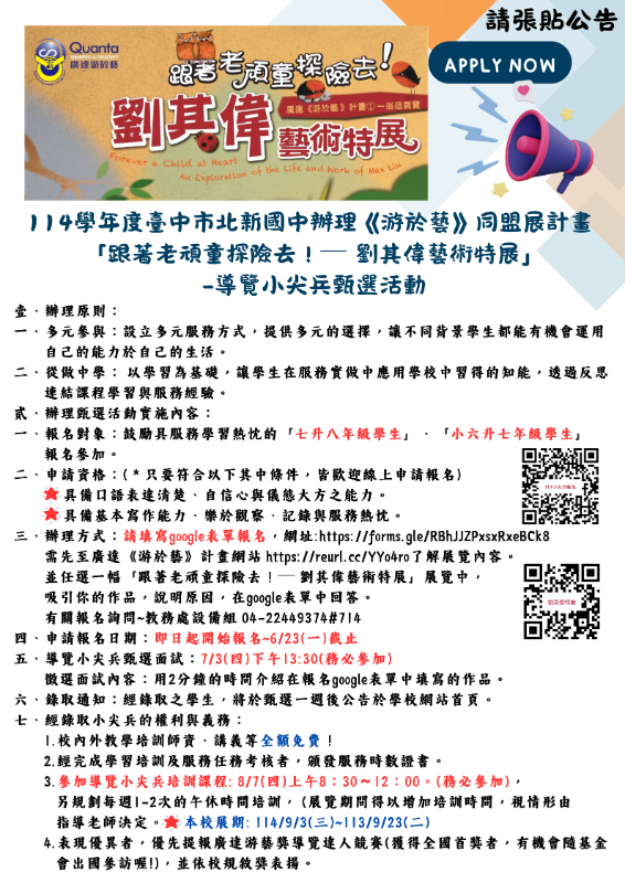 | 標題 | 114學年度臺中市北新國中辦理《游於藝》同盟展計畫「跟著老頑童探險去!─ 劉其偉藝術特展」-導覽小尖兵甄選活動 |
