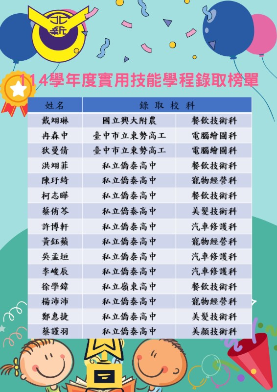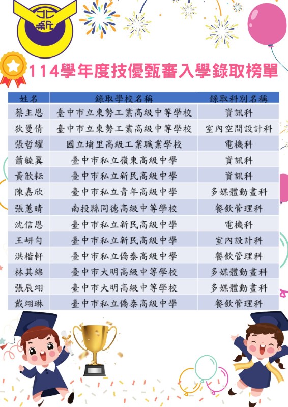 | 標題 | 北新國中114學年度實用技能學程及技優甄選入學錄取名單 |
