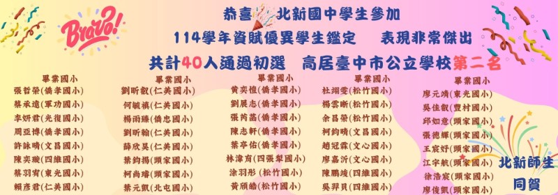 | 標題 | 賀~~北新國中學生參加114學年資優鑑定初選,表現優異 |