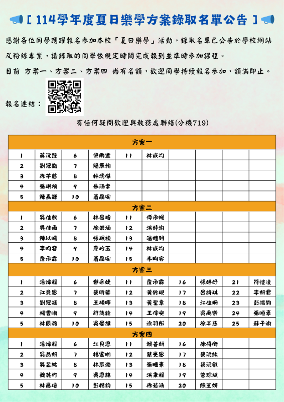 📣【114學年度夏日樂學方案錄取名單公告】📣 感謝各位同學踴躍報名參加本校「夏日樂學」活動,錄取名單也已同步公告於學校網站,請錄取的同學依規定時間完成報到並準時參加課程。 目前 方案一、方案二、方案四 尚有名額,歡迎同學報名參加,額滿即止。截止日期為7/9(三) 12:00,最後錄取名單將於7/16(三)12:00公告。 👉 報名連結: https://forms.gle/GjrjKZ91EGFo2Zhe8 ![]() |