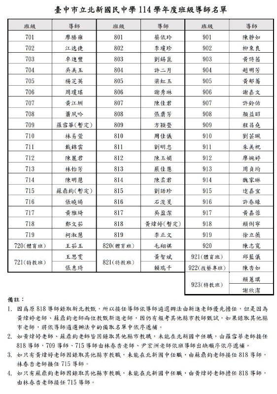 【重要公告】臺中市立北新國民中學114學年度班級導師名單
