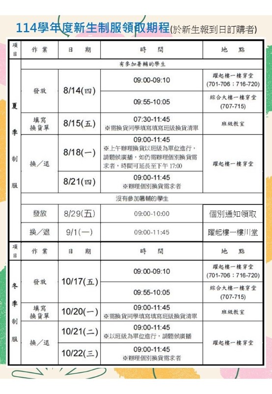 於新生報到日 訂購新生制服的新生 制服發 / 換 貨資訊: ★臂章到貨時間:七年級新生於新生報到日訂購的臂章暫定8/22(五)前送達發給學生。 ★制服換貨: ①8/14(四)回家試穿,要更換的衣服保留原樣,不能下水。 ②請同學在8/15(五)上午11:45前在班上填寫換貨清單,註明原尺寸與要更換的尺寸。(各班派一位代表在上午12:00前交給訓育組以統一連繫廠商) ③8/18(一)帶要換的制服來學校,上午聽候廣播或到班通知,以班級為單位到躍起樓川堂更換。 ④8/18(一)下午5:00前以及8/21(四)上午在躍起樓一樓川堂仍可辦理個別制服換貨需求。 ★8/14(四)尚未領到制服者,請在以下時間在躍起樓一樓川堂辦理:①於8/18(一)上午補繳尾款後現場領取制服。②特別尺寸訂製者或因南部遇雨汙損的制服正製作全新服裝中,預定9/1(一)領取。 ★如有其他問題亦請在班級換貨單上填寫詢問,或818(一)上午8:00-12:00,下午1:00-5:00在躍起樓一樓川堂現場詢問廠商。 ★期程參考:(0814有更新未參加暑輔學生領取夏季制服地點)
