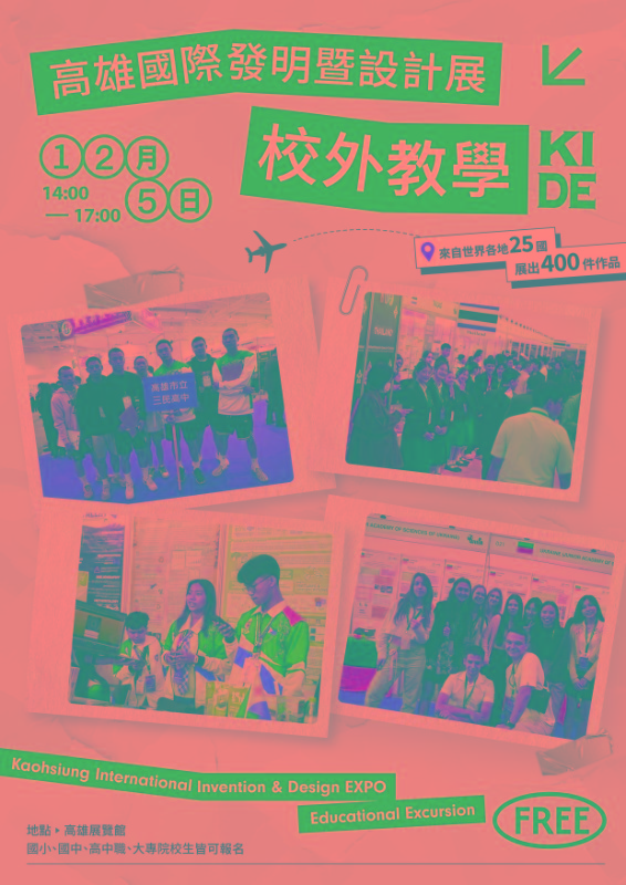 主旨:台灣發明商品促進協會舉辦「2025第12屆KIDE高雄國際發明暨設計展」,敬邀 貴校師生蒞臨參訪,以提升學生對創新發明的學習興趣。