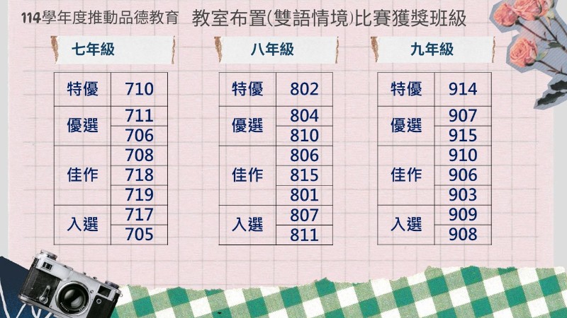 114學年度推動品德教育-教室佈置(雙語情境)比賽獲獎班級