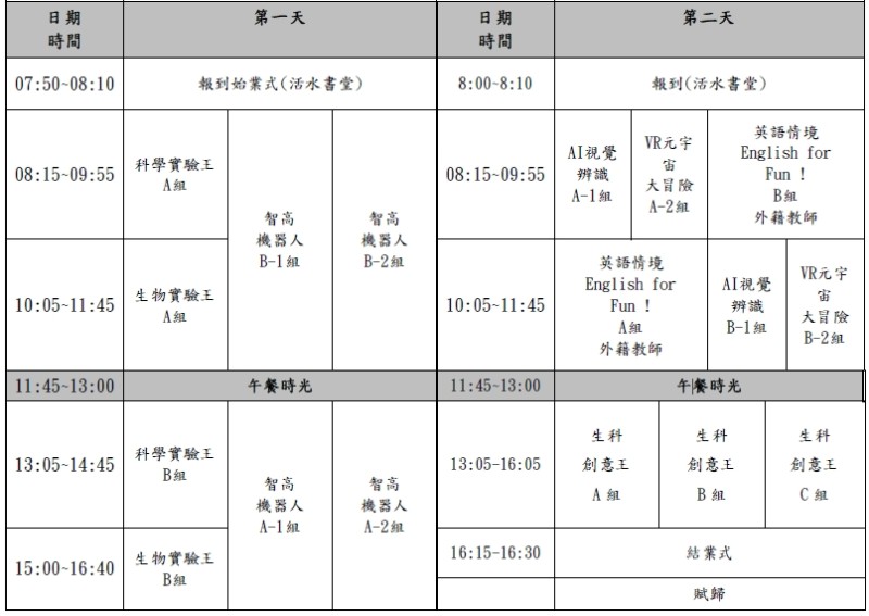 叁、活動資訊:一、活動說明會時間:114年12月7日(日) 9:00-11:30(本校活動中心)二、活動時間:115年1月27-28日,活動時間詳如下列課程表。三、參加對象:學區國小六年級具多元潛能之學生,預計錄取80位學生,如報名人數過多,再視報名情況,在1月28-30日加開梯次(以電腦隨機排序安排梯次)。四、活動內容:依報名人數分A、B組,課程安排如下: