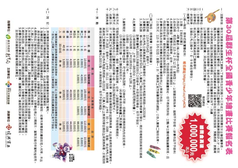 說明:一、比賽方式及時間:(詳細資訊請見簡章說明)【第一階段】實體收件 115年 2月 12日 (星期四) 前,郵戳為準【第二階段】現場複賽 115年 3月 14日 (星期六) 8時 至12時地點:復興商工二、參加對象:全國各公私立國中 7、8、9 年級在學學生。三、獲入選以上之學生申請就讀復興商工,享優先錄取資格。四、線上報名網址:https://reurl.cc/rYy4Ok五、比賽簡章公告於群生基金會網站首頁 https://ischool.fhvs.ntpc.edu.tw/ischool/publish_page/193/,敬請下載查閱。