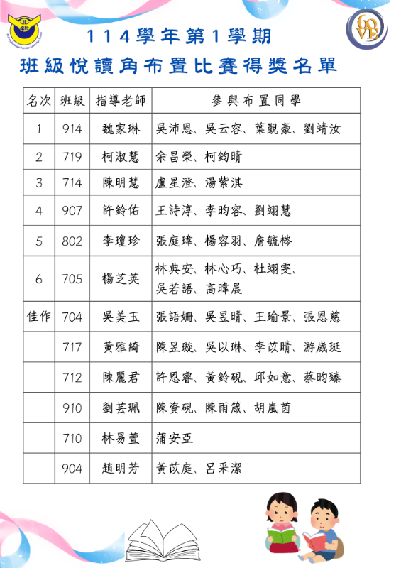 114學年度第1學期班級悅讀角布置比賽得獎名單