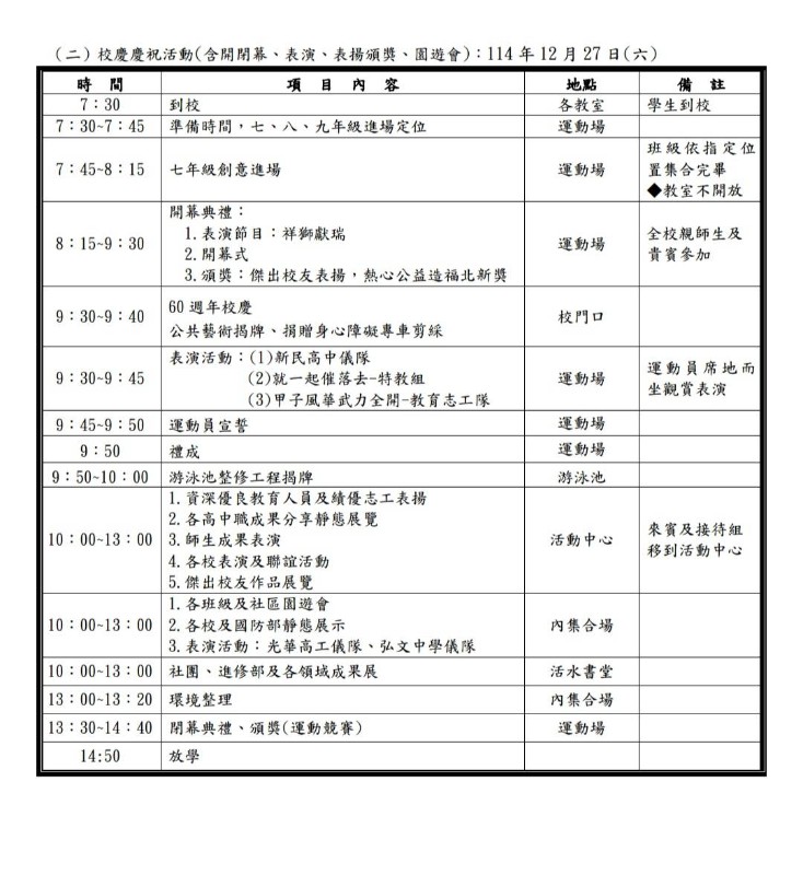 (二)校慶慶祝活動(含開閉幕、表演、表揚頒獎、園遊會):114年12月27日(六)